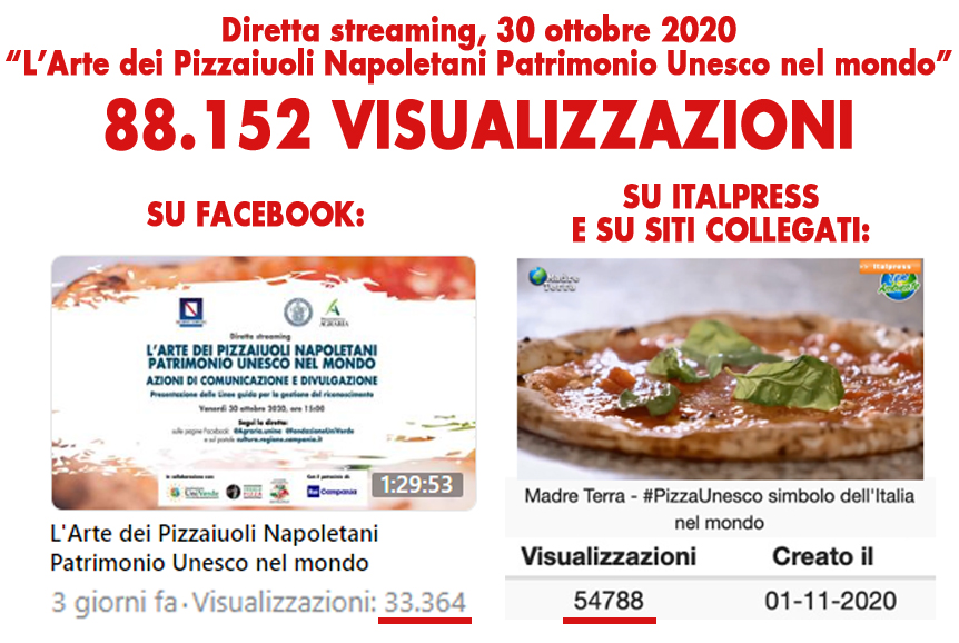 Hanno superato quota 88.000 le visualizzazioni per la diretta streaming del 30 ottobre “L’Arte dei Pizzaiuoli Napoletani Patrimonio Unesco nel mondo. Azioni di comunicazione e divulgazione”. I numeri sono stati raggiunti su Facebook, sul sito dell’Agenzia di stampa Italpress e sui siti ad essa collegati.