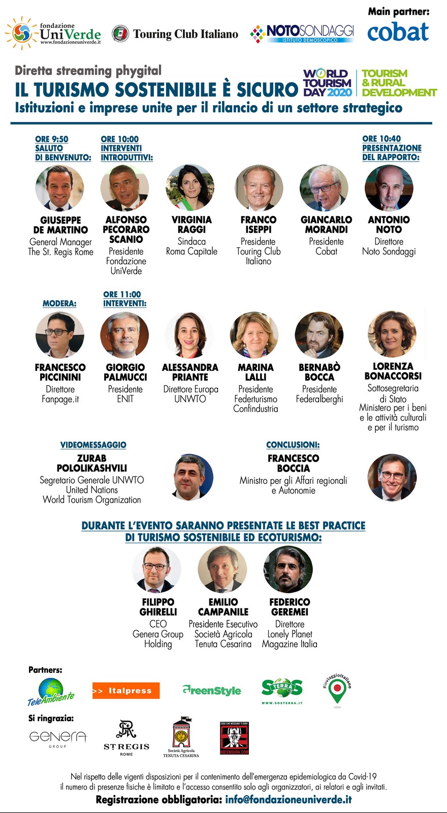 Dopo il saluto di benvenuto di Giuseppe De Martino (General Manager, The St. Regis Rome), interverranno: Alfonso Pecoraro Scanio (Presidente Fondazione UniVerde); Virginia Raggi (Sindaca Roma Capitale); Franco Iseppi (Presidente Touring Club Italiano); Giancarlo Morandi (Presidente Cobat); Antonio Noto (Direttore Noto Sondaggi) che presenterà i dati del 10° Rapporto “Gli italiani, il turismo sostenibile e l’ecoturismo”; Giorgio Palmucci (Presidente ENIT); Alessandra Priante (Direttore Europa, UNWTO); Marina Lalli (Presidente Federturismo Confindustria); Bernabò Bocca (Presidente Federalberghi); Lorenza Bonaccorsi (Sottosegretaria di Stato, Ministero per i beni e le attività culturali e per il turismo); Zurab Pololikashvili (Segretario Generale UNWTO – United Nations World Tourism Organization).